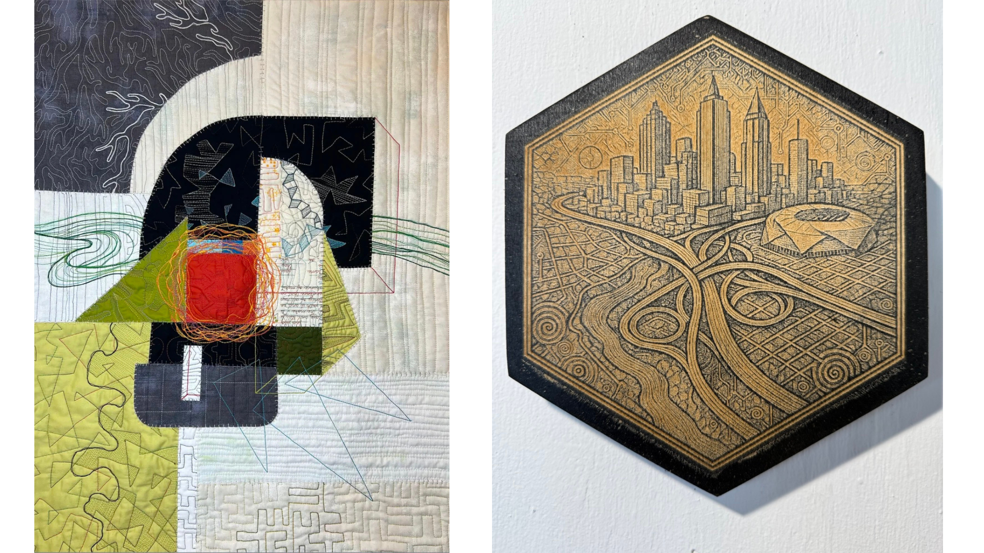 Jones’s textile works unfold through pieced geometry, layered color, and stitched line, expanding outward as if testing the limits of space and containment. Her compositions suggest movement, growth, and the freedom found in allowing form to remain open and unresolved. Morton’s carved and burned works, by contrast, are grounded and meditative, anchored in systems of balance, symbolism, and control. His use of wood and slate emphasizes permanence, weight, and careful restraint.